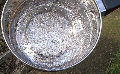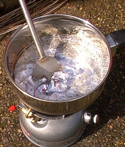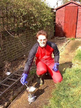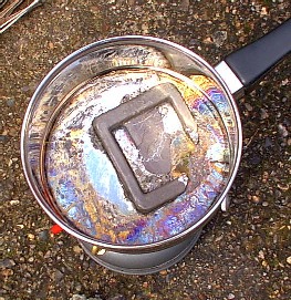 Put lead in saucepan, and put saucepan over fire - A camp fire would do, but I used a Coleman's stove. I also used thick gloves and an old undersuit, just to make sure that I was safe from any lead splashes that might happen.